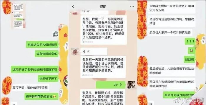 另外,曾有狗仔晒出邓莎与景甜的聊天记录中,也显示疑似张继科跟多位圈内有人借过钱,包括田亮、邓莎、袁姗姗、景甜等,邓莎是从于正那得知张继科有跟景甜借过钱,便找到景甜询问,只是景甜没有肯定回复,只说怎么着张继科都会还。