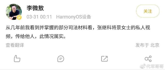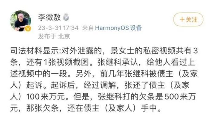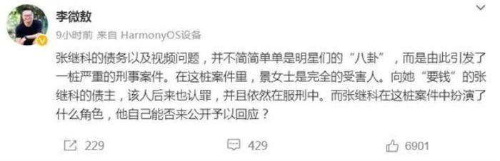 除此之外,李微敖再次发文表示张继科事件升级,并不是普通的八卦事件而是刑事案件,拿到景甜私密视频和截图找景甜“要钱”的债主,至今仍在服刑。