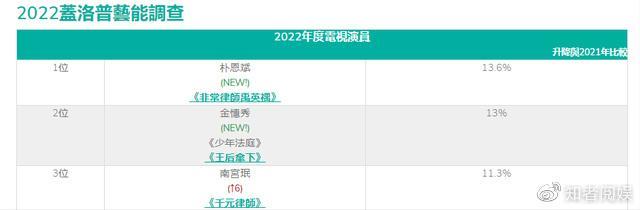 同样是首次进榜的韩国女演员朴恩斌,主演的作品其实并不多,代表作也没有宋仲基、金惠秀和南宫珉等演员多,但是她还是凭借着《非常律师禹英禑》这一部剧成为了韩国年度演员,支持率占比达到13.6%,成为最终的赢家。
