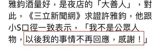 意想不到的是,小S得知此事居然很淡定,甚至还说老公许雅钧不是公众人物,以后关于他的事自己就不再回应了。
