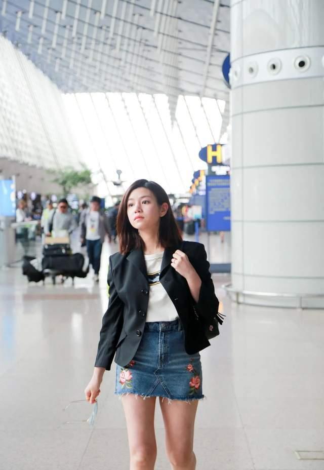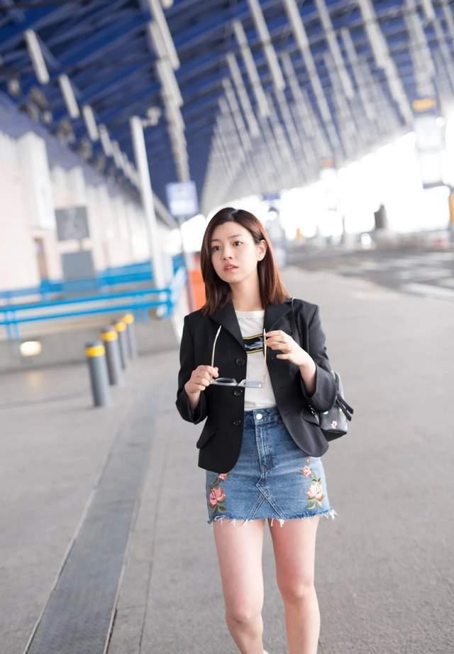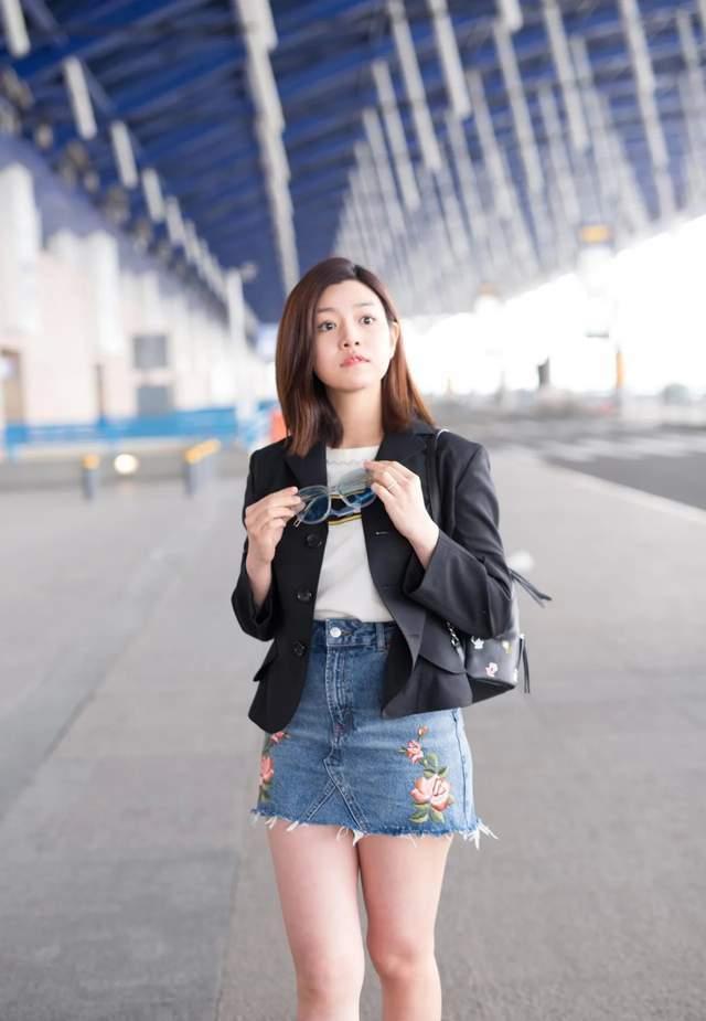 蓝色牛仔短裙俏皮又时尚,搭配黑色平底鞋慵懒又舒适,而上衣外搭的休闲西装外套又为她带去了几分轻熟气质,更显风格的层次感。