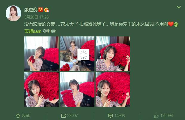 2016年10月,张嘉倪微博晒图文:“ok!有你我便有了全世界!”