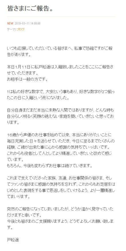 日本知名声优户松遥于今日(1月11日)在博客上宣布和一般男性结婚!并表示之所以选择1月11日,是因为自己最喜欢1这个数字,所以挑选了三个1的1月11日。又是一般男性的胜利!