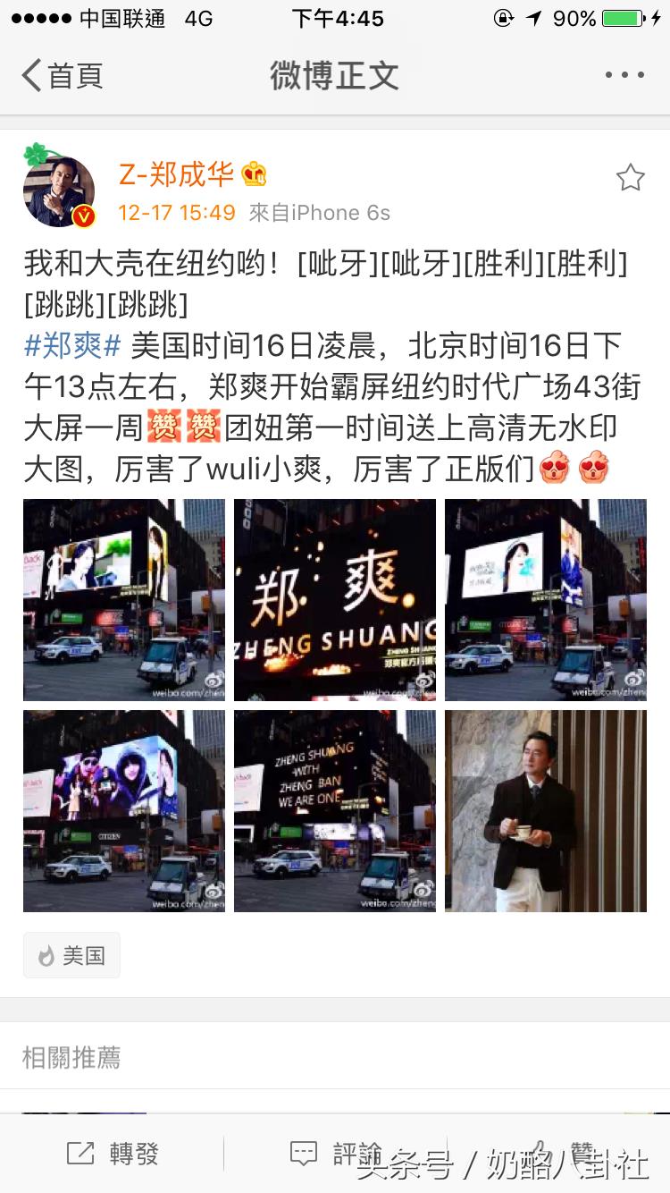 虽然郑爽没有微博,但是爽爸却在微博上晒出了照片,并表示他与郑爽都在纽约,表现了对这次活动的大力支持