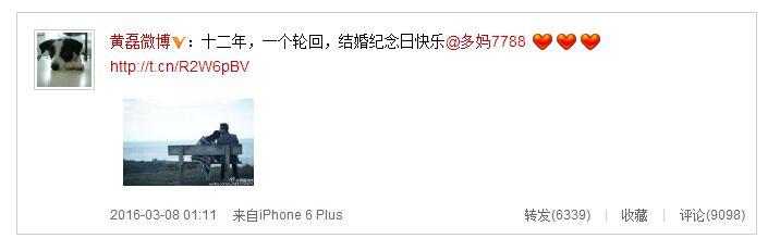 2016年3月8日,黄磊晒出一张和孙莉甜蜜依偎的照片,庆祝两人12周年结婚纪念日。黄磊配文称:“十二年,一个轮回。”随后,孙莉在微博晒出一张二人嘟嘴亲亲的四连拍,甜到掉牙。