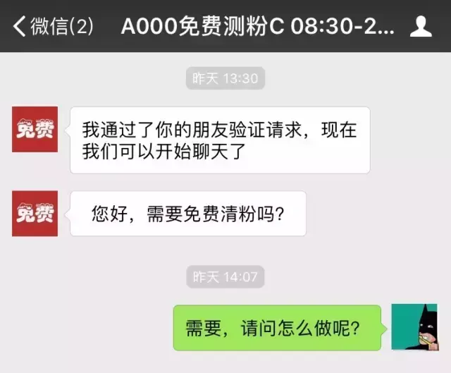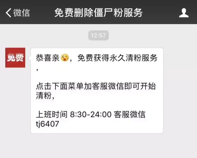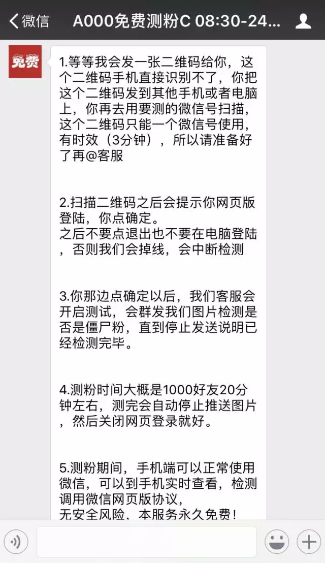 “你好~我在测粉,勿回,打扰请见谅。关注公众号,每月免费测一次~”