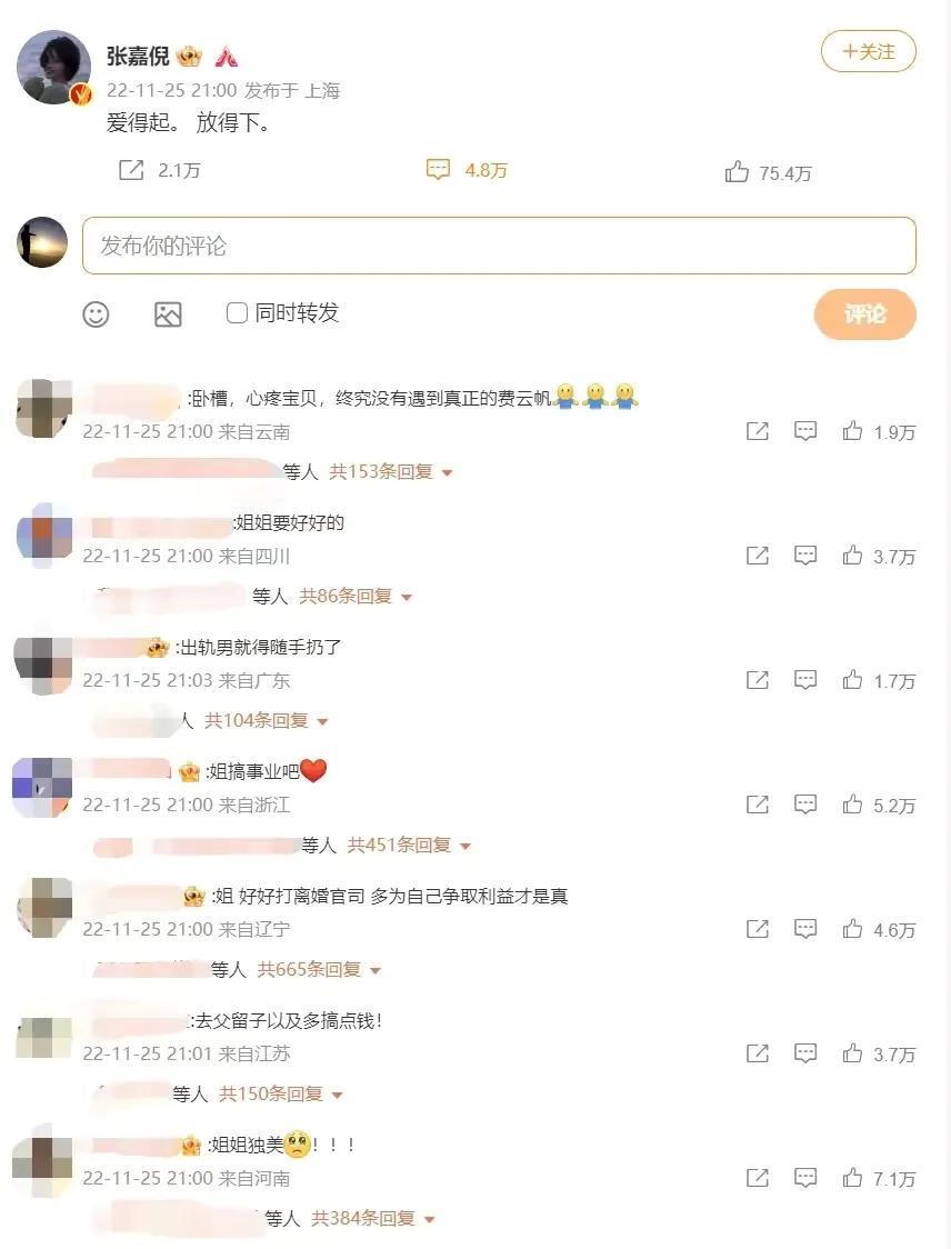 消息一经流出,网友们开起了又一波的激烈讨论。就在大家关心张嘉倪会如何面对这件事情时。晚上9点,张嘉妮在社交平台发了六个字:爱得起,放得下!