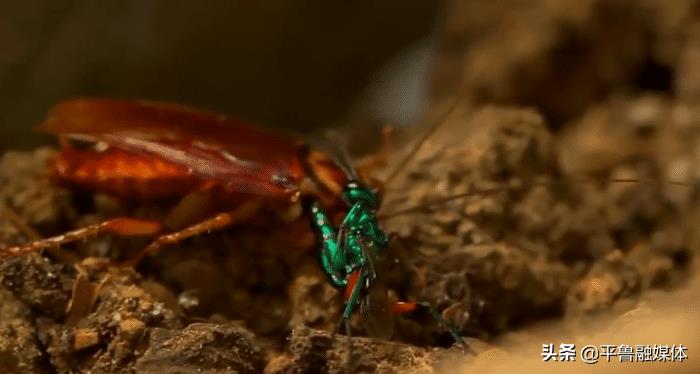 究竟这体型比蟑螂还要娇小的生物,是如何将蟑螂变成它们的傀儡的呢?首先,扁头尼峰会从蟑螂的正上方开始攻击,这也正是蟑螂的弱点,先是咬住蟑螂,并用它们身体尾部的毛针刺入蟑螂的身体中部,这第一针的目的是麻痹并瘫痪蟑螂,只需要几秒钟的时间,蟑螂就会乖乖的躺在那里任其摆布。