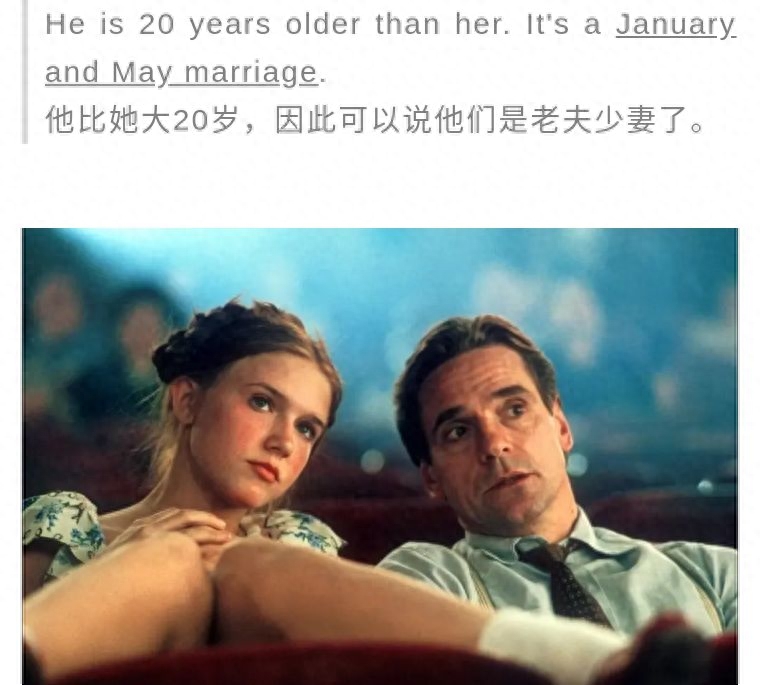 January and May并不是说“一月和五月”,它常和marriage或romance连用,表示“老夫少妻”。通俗一点说是“老牛吃嫩草”,文雅一点说就是“一树梨花压海棠”。