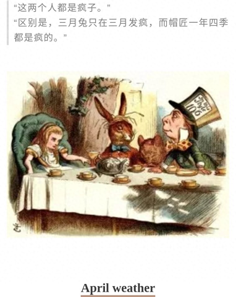 在《爱丽丝漫游奇境记》中就有一只“三月兔”,里面有这样一段台词: