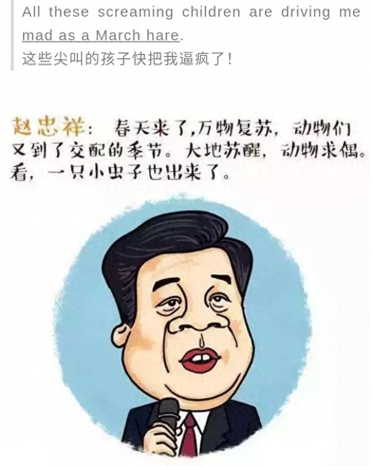 hare是野兔,三月是兔子发情的季节。mad as a March hare意指“像三月的兔子一样疯狂”,用来比喻处于异常兴奋状态的人。