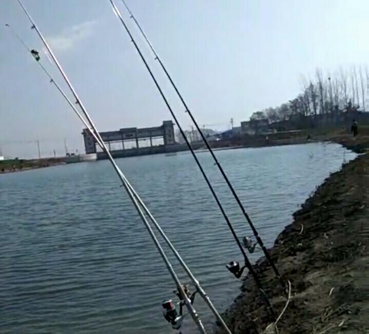 斜式:这种插法比较常见,竿与水面保持30~60角均可。这种插法无论是插竿、紧线还是提竿都比较方便,也好观察鱼情,上钩后竿梢的反应也是很灵敏。此法在1~2级乙必风时采用,风大了,抗风力显得较差。