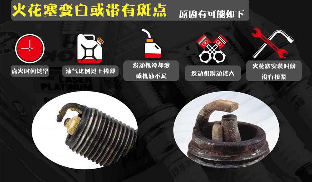 偏白并且带有斑点:火花塞过热导致早燃。除了油气混合比过稀意外,点火正时提前,润滑或者发动机冷却液不足,甚至是火花塞没有扭紧都有可能导致这个原因。使用高于原厂建议值较高的火花塞也会导致此问题。