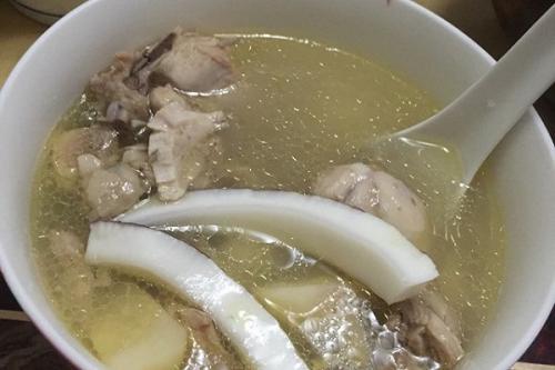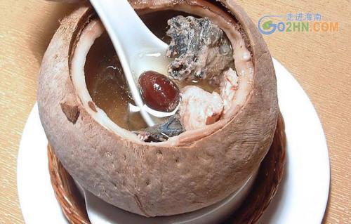 2、先将鸡熬一个钟头,再放入椰子肉再熬一个半钟,加入少许盐调味既可。