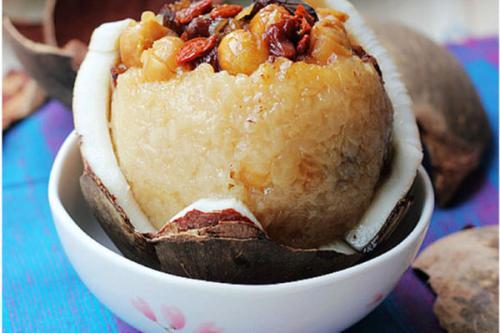 原料:老椰子1个、糯米100克、花生少许、枸杞10粒、红枣3粒、莲子10粒、葡萄干10粒、冰糖适量。(椰子饭的材料无需拘泥,还可以放入鸡肉、排骨和腊肉等做成咸味八宝饭。不过正宗的椰子饭是用糯米1000克、椰子1只、白糖200克、淡鲜奶200克(沸水亦可)作为原料进行烹饪而成。)