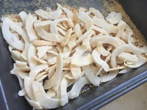 2、倒入切好的椰肉片,小火,不断搅拌一直到水差不多被炒干。3、把椰子片放到烤盘上,大约140℃烤12-15分钟。(这个根据自家烤箱情况,别焦了就行)