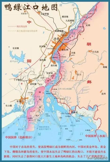 由于历史原因,如今的鸭绿江出海口基本上被朝鲜所占据,靠近我方的鸭绿江下游出海口的黄金坪、绸缎岛、薪岛、马鞍岛等岛屿由于河道常年淤积堵塞,这些地方已经和我们的本来河道和国土连接在一起;以及鸭绿江受自然规律的变化,鸭绿江未来所产生堆积而形成的一些滩涂或者形成的新岛屿大概率已经和我们无关了。