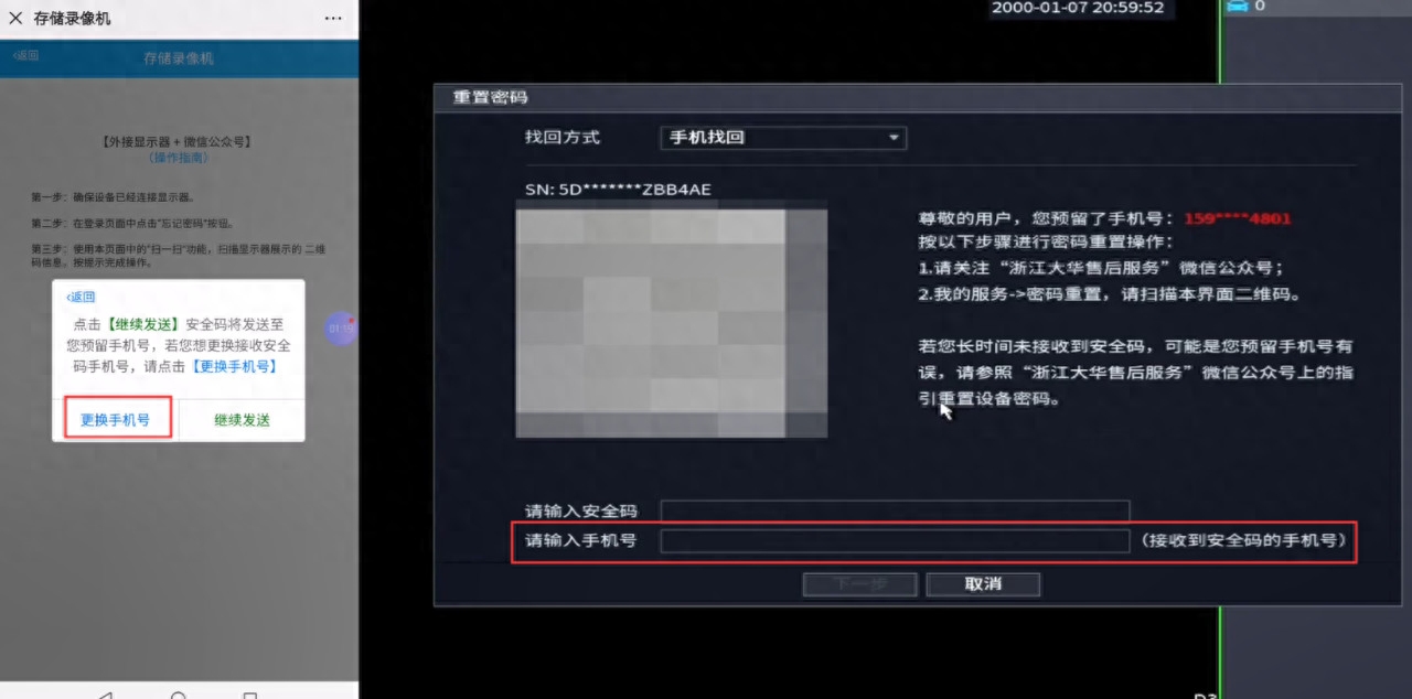 然后大华,录像机本地在重置密码界面有“请输入手机号”的提示,