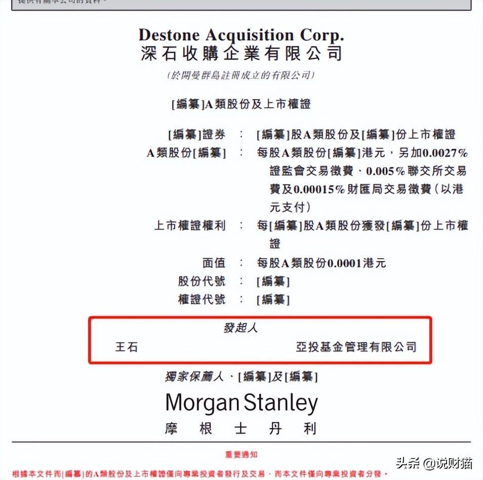 4月8日,深石收购企业有限公司(Destone Acquisition)在港交所递交了一份312页的招股书,发起人为王石和亚投基金管理有限公司(亚投资本)。