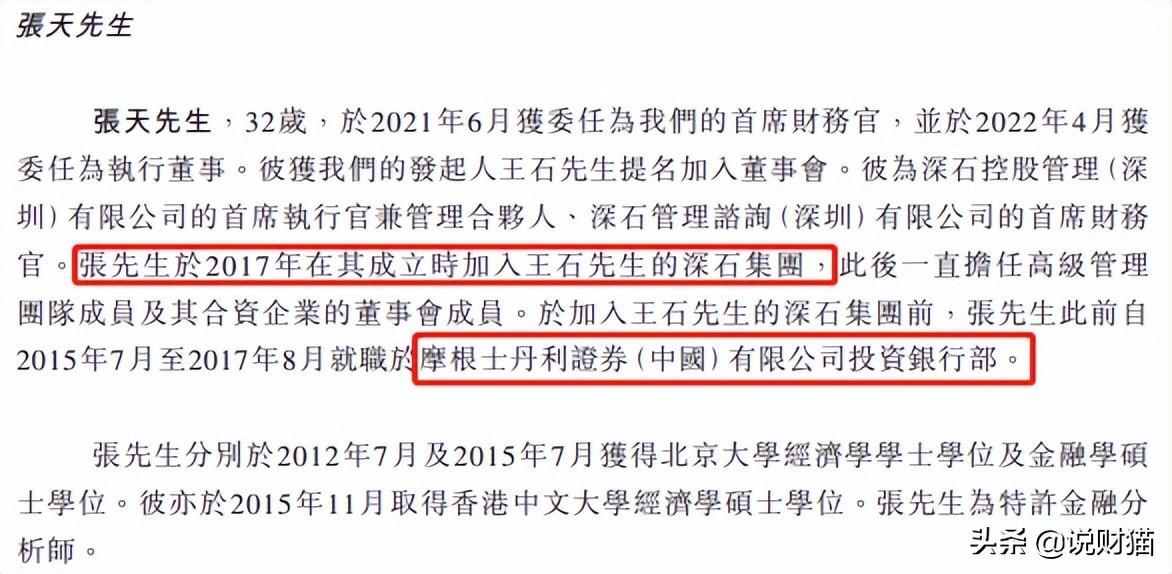 2017年,张天从任职了两年的摩根士丹利投资银行部出来,结识王石后,加入了王石的深石集团,并一直担任高管团队成员。
