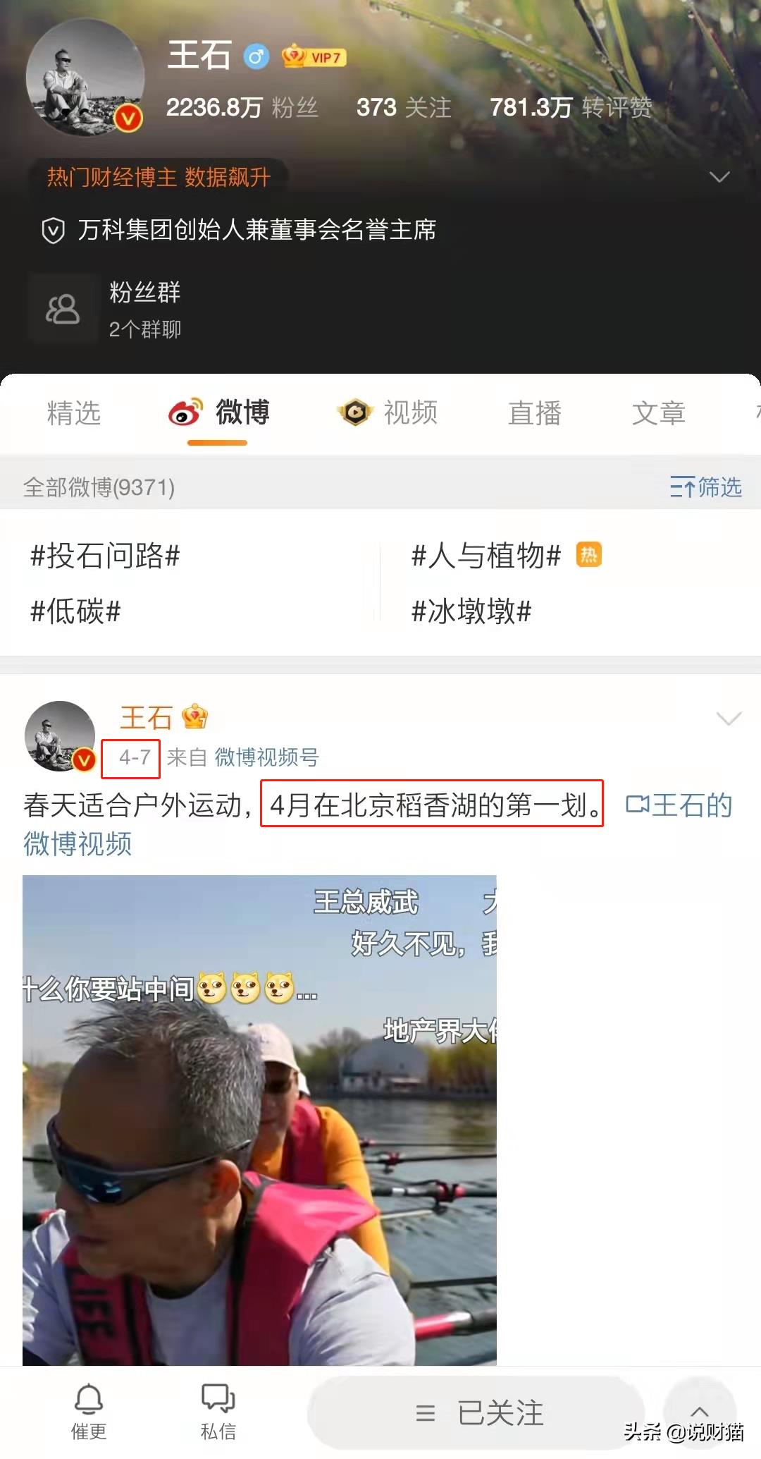 此后,王石便活跃在微博,嗮划艇、运动健身、拍抖音短视频等日常,继续发挥余热。