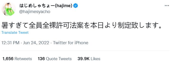 “天气热成这样,应该制定一个法律,允许所有人裸奔。”