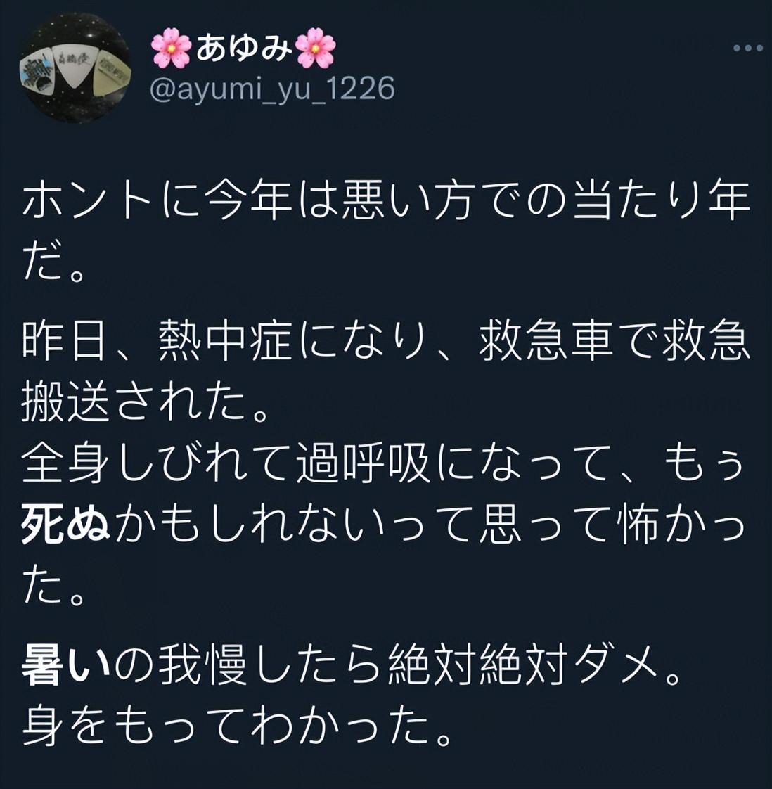 “今年真是糟糕啊……昨天我中暑到进救护车了,我甚至一瞬间觉得可能要过呼吸到死亡了吧。