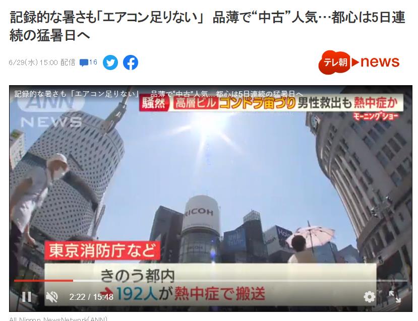 东京都从28日开始,连续两天每天都有超过200人因为中暑被送医,整个6月有1223人因为中暑而被送到医院。