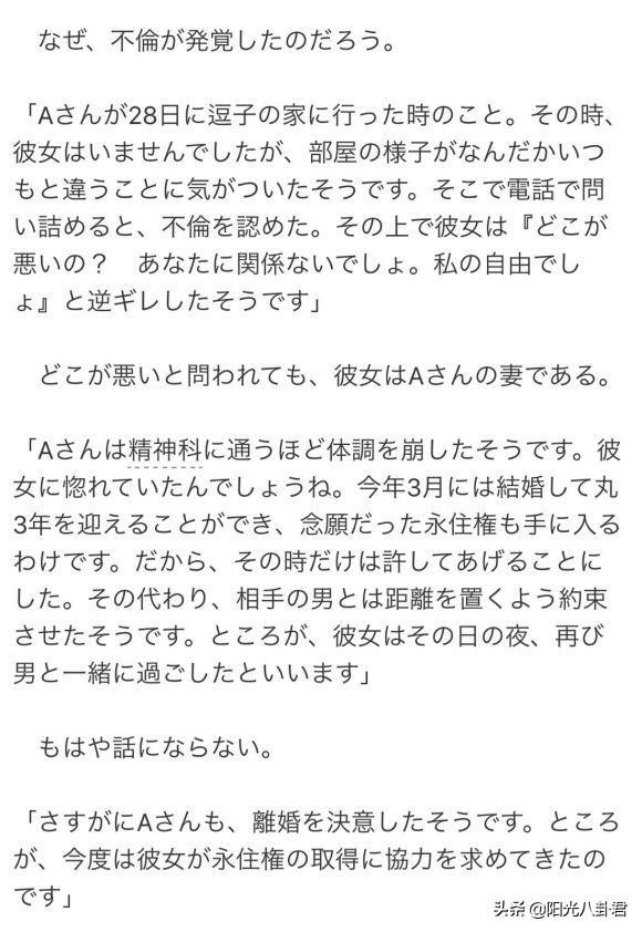在此事爆发后,A先生曾因此精神受挫,体调崩坏,去精神科看病,但由于今年3月就是结婚满3年的日子,那时女方就能拿到永驻,所以A先生一时心软原谅了她,并约定好不许再和情夫接触,但是当天晚上邢鹿仍然和情夫共度一夜。
