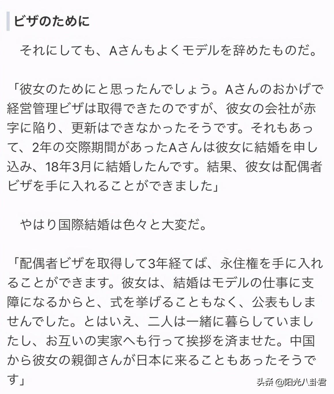 报道中指出,邢鹿前夫A先生曾是一位活跃于巴黎时装周的top class(顶级)模特,早前在日本发展模特工作的邢鹿为了将演出签证变成常驻签证,不仅让与自己交往已久的A先生放弃工作成为自己模特业务中介公司的员工,后续更是为了拿到永久签证,与对方偷偷结婚。