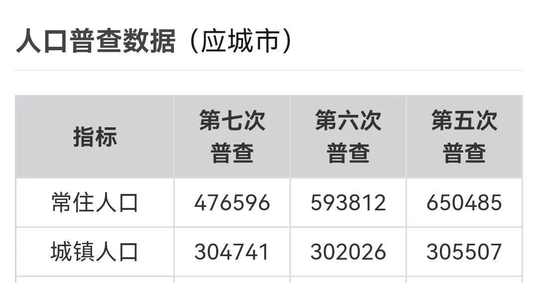 根据第七次人口普查数据,截至2020年11月1日零时,应城市常住人口476596人。