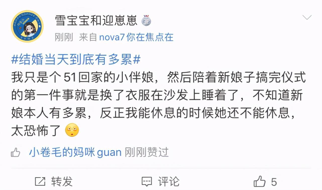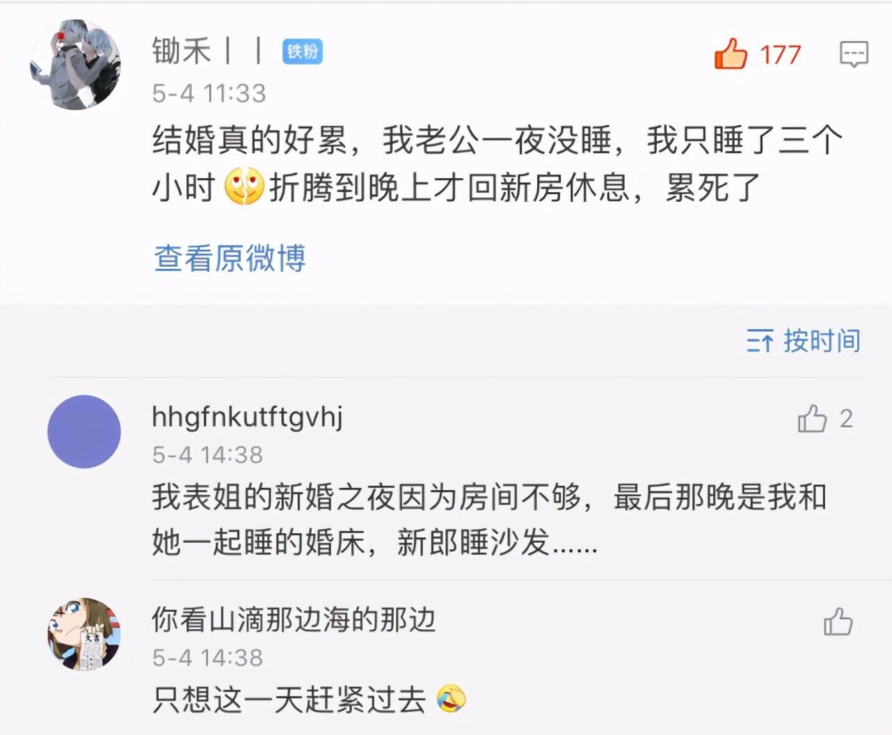 凌晨几点就要起床,要吃姐妹饭,伴娘还可以回去补眠一会,新娘却还要化妆之类的,到白天几乎是强撑着睁眼,累得都走不动路。