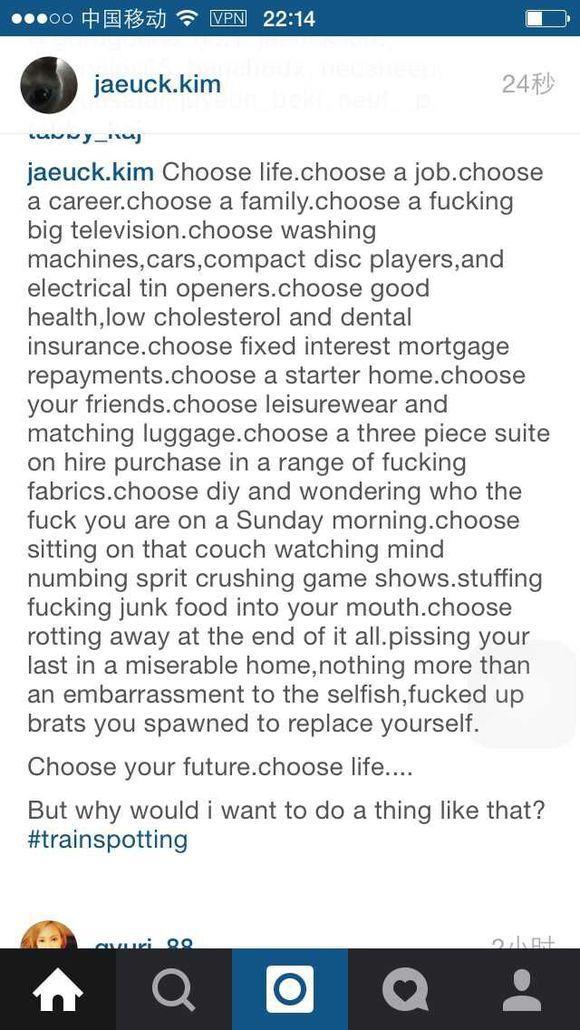 三年前,金材昱曾经在自己的ins上po过一张照片和一大段台词,来自他喜欢的电影《猜火车》。