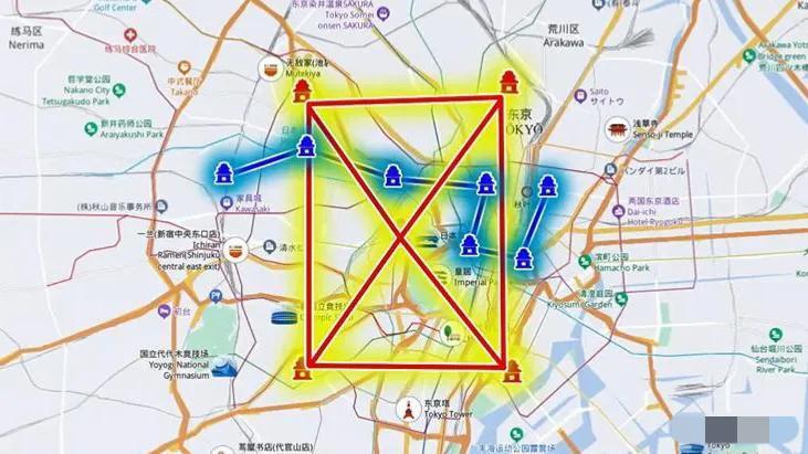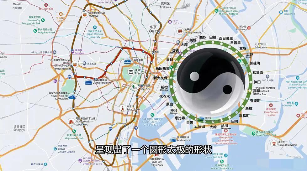 来到东京旅游的人一定都坐过山手线,这个线路是根据风水学建设的,呈现出一个圆形太极图的形状。在太极图的中间还有一条“太极线”。这个太极图正好盖在了北斗七星之上。这个圆形太极图直接切断了北斗七星的头部和尾部,同时也切断了兜神社和凯神社,这象征着切断了武士的命脉和武装力量。