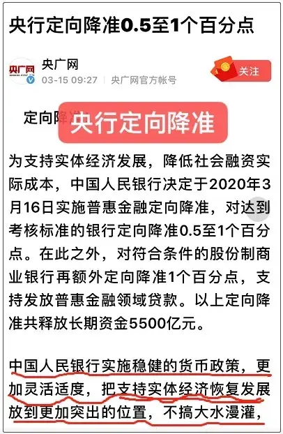 疫情以来,国家出台了大量的促进经济的政策。比如减免税收和社保、新一轮数十万亿级的新基建、今天又是新一轮央行定向降准......