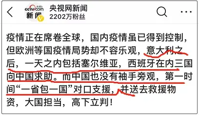 最后,在国内抗疫还未完胜前,我们的对口援助队就已经迅速走向世界,帮助疫情严重的国家抗疫,从根本上减少境外输入的风险。比如:四川支援意大利、广东支援伊拉克、上海支援伊朗、江苏支援巴基斯坦......“一省包一国”,用中国经验帮助他们尽快控制疫情。同时,专家也多次与西方多国专家通过跨国视频会议分享抗疫经验,中国经验正在全球产生正向作用。