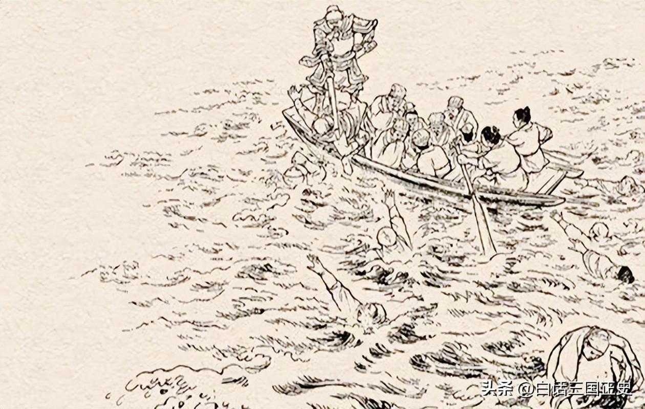 士卒们下去后,争着往船上挤,无法制止。董承、李乐持戈砍那些扳着船的手指,掉落在小舟的手指多到可以捧起来。
