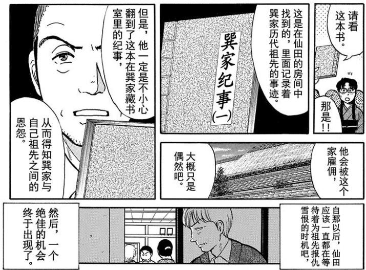 在后续的调查中,大家还发现了关于仙田的一些事情:他是传说中那个被杀的“猎头武者”后代,为了替祖先复仇,才把目标瞄准了当年叛变士兵的后代巽家。