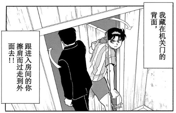 当金田一通过旋转门进入房间时,躲在门后的仙田顺势通过旋转门走出了房间,因为中间隔着旋转门,两人并未相见。走出房间的仙田立刻将真钥匙交给了紫乃,一个“密室”就这样诞生了。