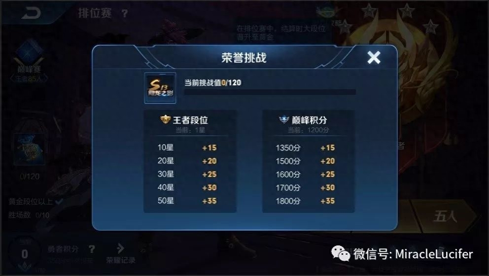 也就是说,赛季进阶皮肤获得的平均条件最低为同时达到王者30星与巅峰1600分,具体为:王者30星,可获得15+20+25=60挑战值;巅峰赛1600分,可获得15+20+25=60挑战值,最终则可获得120挑战值,这对很多小伙伴一定是个新的挑战!