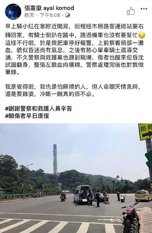 张震岳原文:早上骑小红在家附近闲晃,回程经木栅路客运总站要右转回家,有骑士倒趴在鲁中,路过机车也没有要帮忙,这样不行啦,于是我把车停好报警,上前查看头部一摊血,貌似昏迷尚有气息,之后有热心骑车骑士疏导交通,不久警察与救护车也赶到现场,伤者也醒来但昏沉试图翻身,整张左脸血肉模糊,警察处理完后也对我做笔录。我是觉得啦,我也是怕麻烦的人,但人命关天情急时,还是要鸡婆,冷艳一撇真的很不必。最后张震岳还暖心感谢警察和救护人员,并祝愿伤者早日康复。
