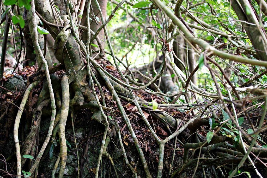 缠勒根是榕属植物的特色。喜欢觅食榕果的鸟类,会顺便把榕树种子排泄到别的植物树干上,当种子发芽后,根部迅速生长,将植物缠绕、勒死,最后占领这棵植物的地盘。