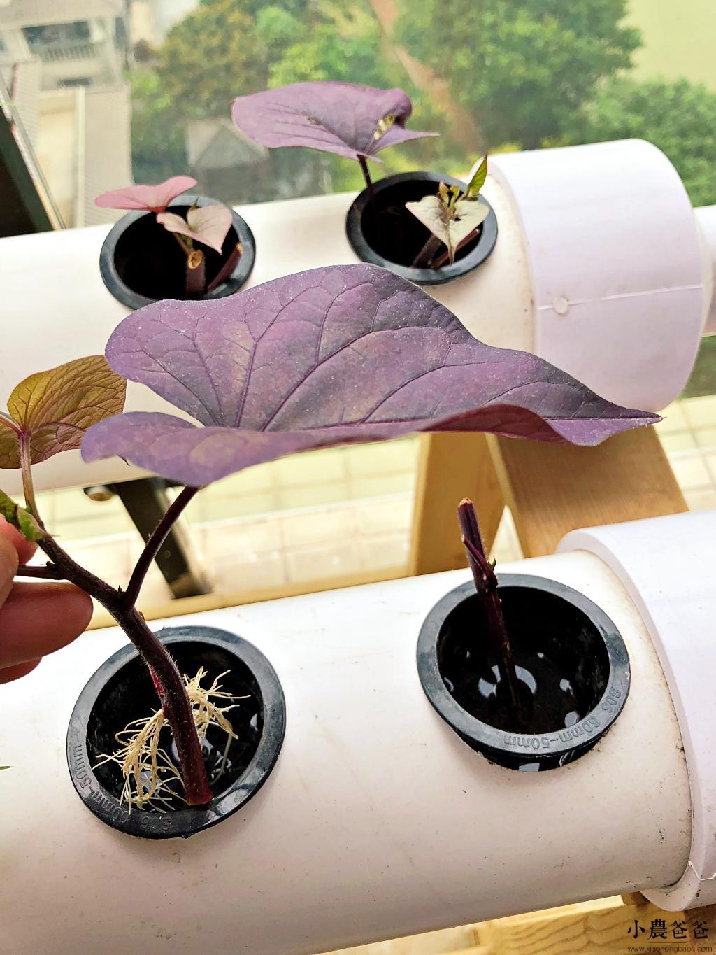 图中鱼菜共生系统水配管里的地瓜苗长出了水生根