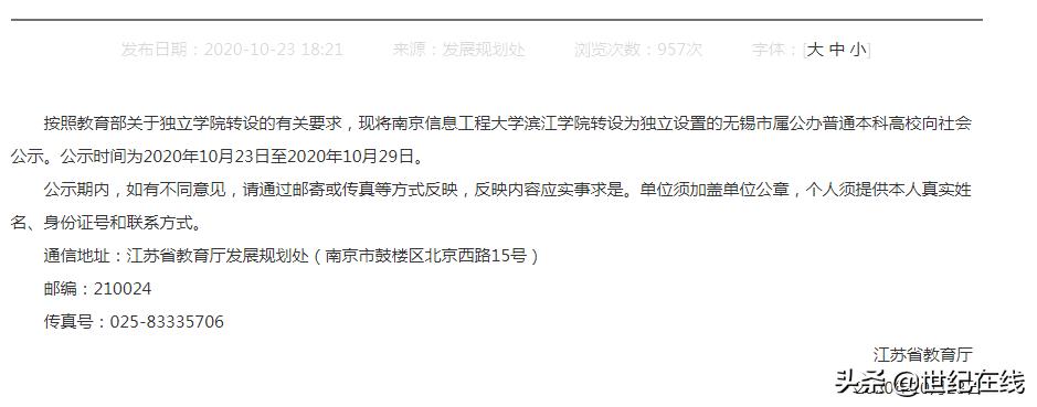 江苏独立学院南京信息工程大学滨江学院拟转设为市属公办本科院校