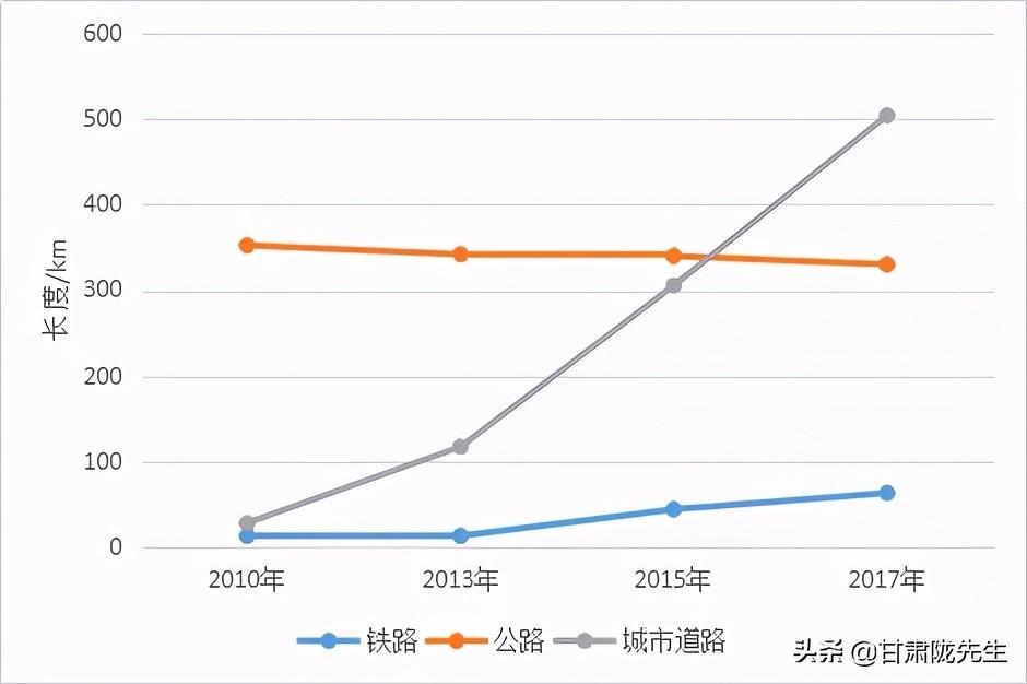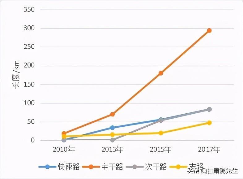作为城市的骨架,兰州新区最先启动城市道路网络规划建设。2010年至2017年,建成城市道路总长度从27km增加至503.81km,年均增长率达330.69%。其中以主干路和快速路的建设为主。