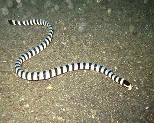 巨环海蛇,体长约两米,毒牙细小,一次分泌的毒液量少。它的右肺几乎占据了身体的右半部分。它可以潜入10丈深的水里,它那象桨一样的尾巴有利于迅速游动到达目的地。主要以鱼类为食,卵生。由于在海里让人防不胜防。