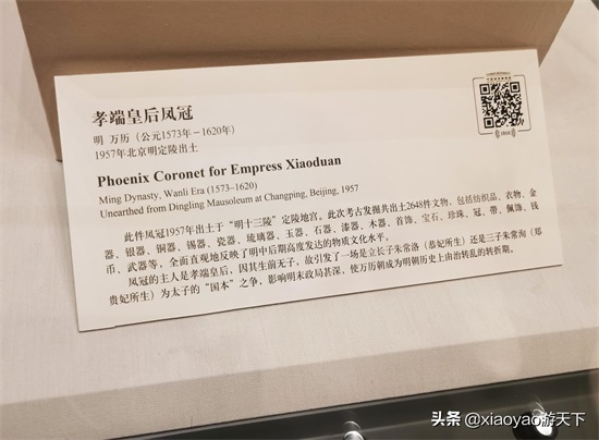 三百多年后的1956年到1957年,在郭沫若的主张下,万历皇帝和孝端皇后的定陵被发掘,出土了将近3000件文物,这些文物中除了万历皇帝的金冠外,还有四件凤冠,其中两件属于孝端皇后,另外两件属于孝靖皇后。目前陈列在北京国家博物馆中的九龙九凤凤冠就是孝端皇后的两件凤冠之一,也是最精美的一件凤冠。