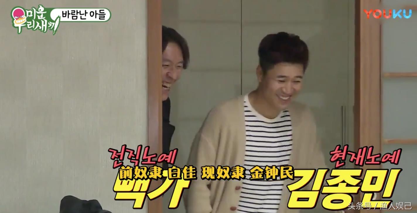 这时字幕说,前奴隶白佳,现奴隶金钟民,原来白佳以前曾和金健模一起合住过,但因为金健模的天真爱折腾的个性,终于还是分开住了。