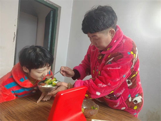 蒜蓉西兰花、大葱炒腊肠是母女俩1月15日的中午饭。刘素云将饭菜端过来后放在桌子边上,将一个勺子塞在雨婷的左手上,雨婷用勺子拔口饭,抬起头,眯缝着眼睛冲妈妈笑,接着吃几口,又停下来开始咧嘴笑,嘴巴一侧露出小酒窝。