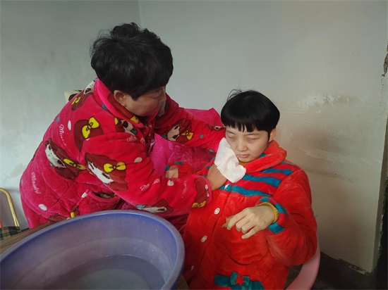 由于生病,女儿的语言、行动和孩子基本没有什么区别,甚至还不如孩子,刘素云平时得像对待小孩那样照顾她。女儿绵软得没有一点力气,站不起来,刘素云抱来抱去。女儿虽说话不清楚,但偶尔也会大喊大叫闹情绪,刚开始时刘素云不知如何开导,只知道搂着女儿抹眼泪,后来她逐渐摸索出方法,买来音响让女儿听音乐转移注意力。几年前,她又买来电视机,闲下来就在家陪女儿看。“她喜欢看电视和听音乐,有时听着音乐,身体还会跟着节奏晃动。”